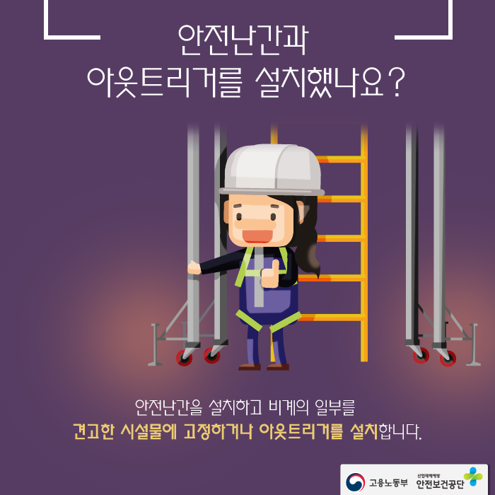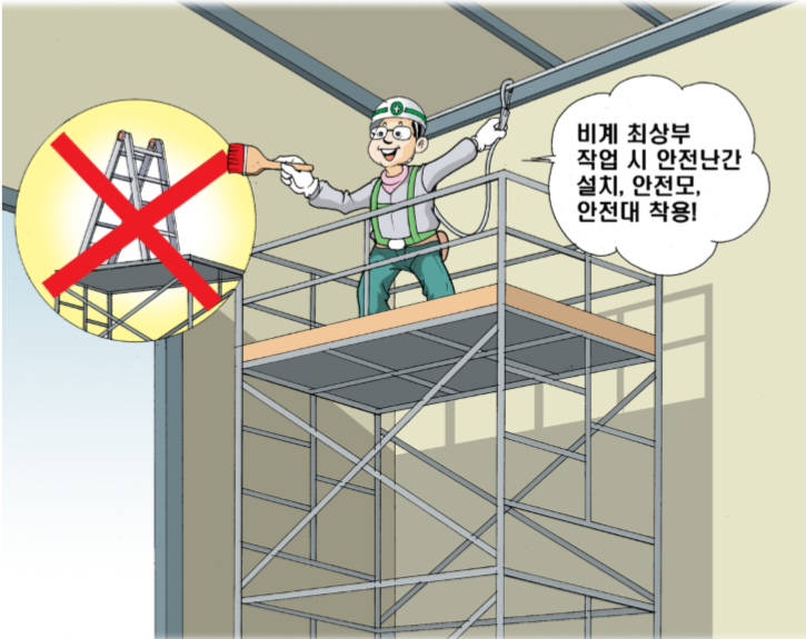 - 고소작업(사다리, 비계 등) 시에는 반드시 안전모, 안전대, 안전화 등 보호장비를 착용해야 합니다.